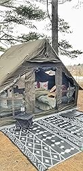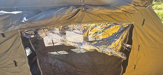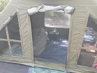 If only the windows & door had privacy curtains/panels on the inside so you didn’t have to go out to roll the ones on the outside down. Then this would be the absolute perfect tent. And this isn’t a complaint by no means be/c you can add them yourself with velcro which is what I did. And this is just a suggestion but it would have been nice if the windows also had the pvc. I absolutely enjoyed camping in this tent! And the fact that it came with a tarp was icing on the cake. My first use of the tent it rained and the tarp did a great job keeping the tent nice and dry. It’s the perfect size for one person although 2 people would be comfortable but would not recommend no more than 2 people. I almost wished I’d gone with the 10×13. I think I may end up with that one as well. The material is great, almost a lighter canvas. And the floor is pvc which you could easily be happy without any floor covering. If you are on the fence, just go ahead and climb over it to that whatcampingtent.com cart and hit purchase! You are going to love it.