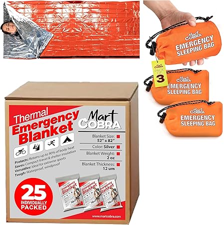 Mart Cobra Emergency Blanket 25-Pack and Emergency Sleeping Bag x3