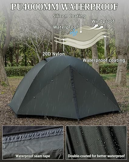- Waterproof: The backpacking tent is made of 20D nylon material, covered with silicone oil coating and waterproof coating, with waterproof adhesive strips at the internal seams, excellent waterproof performance, up to PU4000mm. in case of prolonged rainfall or downpour, it is recommended to use it with a tarpaulin