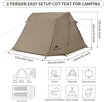 - Cot Tent for 2 Person: Tent Dimension:220 x 140 x 130cm/86.6 x 55.1 x 51.2inch,wider than the usual 2 person tent, larger room for two person sleep comfortably. Used with the camping cot to be a cot tent, keep away from the ground,moisture-proof and cold-proof, this is a great value tent suitable for all weather and all season camping!
