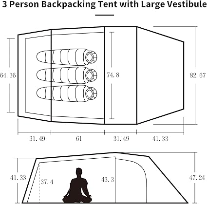- 3 Person Backpacking Tent with Vestibule: The 3 person tent is designed double walled tent with large inner tent(92.5 x 74.8 x 43.3 inch), enough spacious for 3 person to sleep comfortable inside; the vestibule with height up to 47.2inch, spacious headroom for 3 man to sitting up inside, and you can put your camping gears, like camping table, cookwares, backpacks, shoes and other stuff.