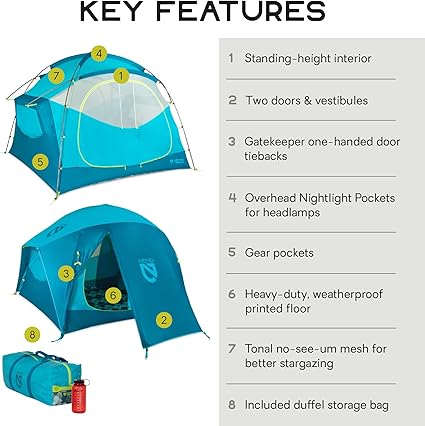 Dear hubby and I had a shorter 4 person dome tent. It was a very decent tent, BUT we are in our 60s now and crawling in and out and within the tent was getting to be too hard. We switched to the 6 person Nemo Aurora and it’s so much nicer for us. It’s pretty easy to set up. I am only 5′ tall so not the best helper for putting up a tall tent, but my husband and I have been able to set this up quickly and without problems. We have plenty of space and can walk around inside. There’s good cross ventilation. We’ve only experienced periods of light rain, but it’s been fine with those. As you might expect, it’s not a cold weather tent. We were up in the mountains near Nederland in the fall and it was pretty cold, even though we closed it up as much as possible. No problems sleeping though with good sleeping bags and pads. This might be TMI but there are two good sized vestibules and we have chosen to use the one in back as our nighttime bathroom. (Not being able to sleep through the night without a bathroom break is another issue with getting older) It’s tight, but there’s enough room in there for our trusty toilet bucket. Absorbent horse pellets are awesome btw. Not having to get dressed and stumble out to a tree or all the way to the vault toilets is wonderful!