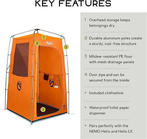 All in all this is an excellent shower tent, however it is impossible as a one person set up and unless you are 6’3 or taller, you will need a stool to stand on for highest hooks. My son is 6’1” and even with longer arms, he had to stretch full body & arm length plus stand on balls of feet to reach upper hooks. Returned. Purchased JOOLCA shower tent – well constructed quality product, sturdy, size same as NEMO, costs much less, NEMO shower bag works same inside JOOLCA as in NEMO, and can easily manage as one person set up.