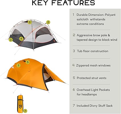 - Tapered profile, aggressive brow pole, and wind-blocking inner tent keep you protected in extreme weather.