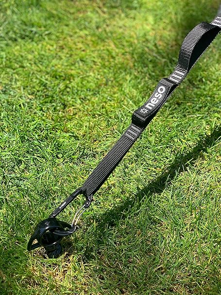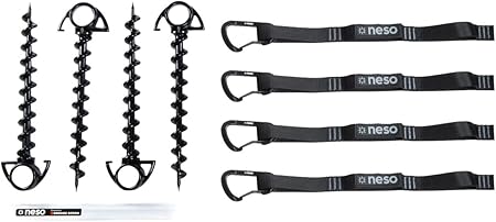 The straps have very little adjustability and the carabiners are the cheap $2 ones. Save your money and buy 4 good ones along with 550 cord and make your own straps. The plastic screw stakes work well in grass but will break if you aren’t very careful.