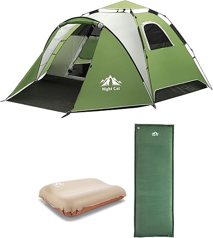 - 【What it Contains】The set includes 1 pcs Night Cat Pop Up Tent, 3 pcs Night Cat Self-Inflating Sleeping Pad,and 3 pcs Night Cat Camping Pillow
