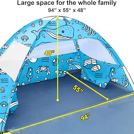 - Cute Pattern, Large Space for Indoor / Outdoors: The beach cabana tent measures 7’10” x 4’7″ x 4′. It is spacious enough to accommodate a family of 3-4 people. With its adorable pattern, it is perfect for use as an indoor play tent, a baby beach tent, a pop-up shade for toddlers, or a sun shelter for everyone. This large beach tent provides instant pop-up shade, making it a versatile and convenient option for various uses.