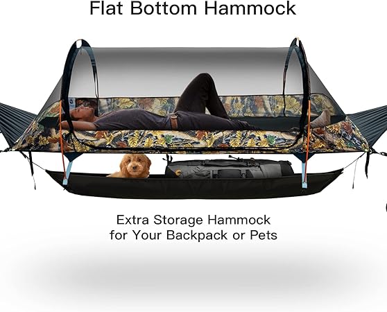 - 【Lay Flat Hammock Tent】 Patented design from Night Cat 3 in 1 Hammock, this upgraded hammock tent allows you to lay flat completely like in your bed,and provide comfortable sleeping overnight, especially better for supine sleepers and side sleepers. The detached storage room on bottom can store your shoes, backpack or even your pet dog