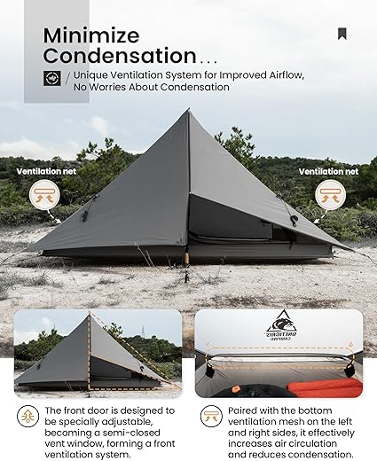 - ★ 𝙎𝙪𝙥𝙚𝙧𝙗 𝙑𝙚𝙣𝙩𝙞𝙡𝙖𝙩𝙞𝙤𝙣 𝙎𝙮𝙨𝙩𝙚𝙢 – Mesh net doors to keep the elements out and the breeze in, mesh vents on both ends enhance airflow and reducing condensation. And plus, the shelter flap can be semi-closed, which provides additional ventilation options