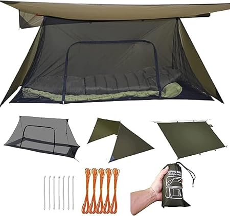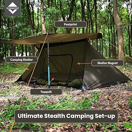 - COMPLETE BACKPACKING TENT FOR STEALTH CAMPING. Experience the great outdoors in comfort and style with Onewind’s Survival Shelter Set. This rugged and durable shelter is designed specifically for Solo Camping with Camping Cot while also providing extra room for your Gear. Each set includes tarp shelter, bugnet, footprint and all necessary accessories for a complete shelter setup.