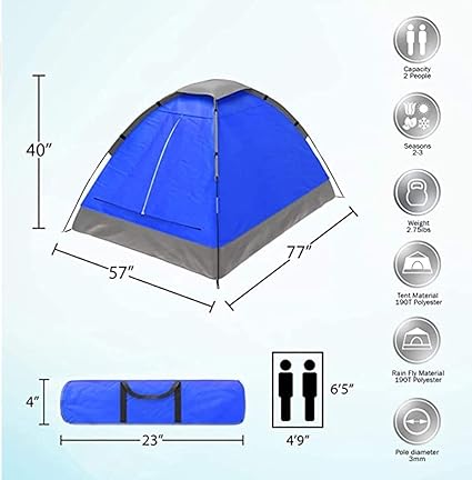- Dimensions: 77″ x 57″ x 40″ Materials: Nylon, Poles: Fiberglass, 8.5mm diameter, Fits: 2 people, Includes: Portable storage bag, Color: Green