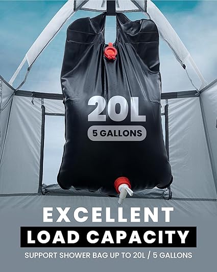 - Durable, Excellent Load Capacity – This shower tent is made of 190T polyester. The removable roof, crafted from PU2000mm polyester, effectively prevents water from entering the tent and provides sun shading. Optimized overall structure and durable top hook can effectively support shower bags up to 20L (5 Gallons), offering a good shower experience. (Bladder and Portable Toilte Not Included)