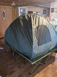 This cot tent is amazing. It’s 40+ lbs but it comes with a rolling case and the case itself is very sturdy. I’ve gone camping with it 2 times now for 3 days of camping and it’s comfortable. The set up was easy, I found an easy way to install it. It only took me 15 minutes to set up the cot and tent itself. The air mattress is comfortable and it holds its air pretty well. I’m 167lbs and after 3 days the air held pretty well. The best part is,…it all fits back into the bag, no problem. Just have to take your time with it. The cost was worth the value of this cot tent. It’s excellent. The only thing I wish it had was a mosquito netting on the inside doors, so I could leave it unzipped. I just ended up buying a mosquito net tent to cover it and that works fine. But it would be nice if it was built into it. All in all, I’m really happy with this purchase.