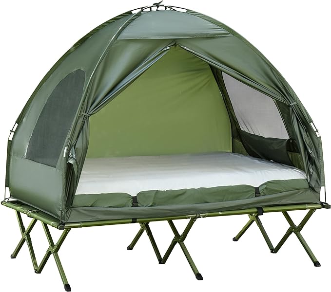- Camping Combo: This multifunctional portable camping set includes an off the ground tent, 2 person cot, air mattress with pump, and bedspread. Both the tent and the camping bed are foldable, which greatly saves space when not in use. Multifunctional bag for easy carrying and storage.