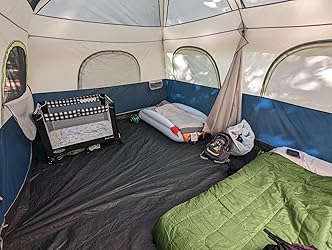 This tent arrived earlier than it’s projected delivery date. So that’s a plus. I bought this for 10-person tent for 4 people. My husband, son, and I set this up in 40 minutes the first time we were trying it out, which is not bad at all considering it was the first time we took it out of the box, counted parts, and had to closely read and follow instructions. I think we can halve that time next time. Took 3 people 20 mins to take it down and pack it up neatly. The tent is very spacious inside. I’m 5’4” and when I stood upright and with my arms extended straight up I barely touched the roof. It has 5 windows. The roof is mesh which is nice for those hot muggy nights or if you just want to feel like you’re sleeping under the stars. But attach the rain fly that comes with the tent if there’s any chance of rain or too much moisture at night. We like this tent very much. Good quality. Definitely practice setting it up in your backyard before taking it out in real camping situation. We practiced and timed ourselves so we know how much time we need and if we have all we need.