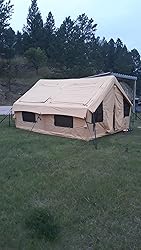 We set this inflatable tent up in our patio area first time just to make sure we knew how to do it since this is our first inflatable tent. Even though we couldn’t stake down the foot print of tent since we were on concrete, it went up very quickly. Can’t wait to get to a state park to set it up for a couple of weeks! It has lots of room, 10ft x 13ft. The fabric looks very good and sturdy and is kind of a khaki color. While it does weigh 70 pounds, it fits in its carrying bag and my husband could carry over his shoulder, but he takes one end and I take the other to make it easier to move it. While this is an expensive tent, we plan to use it quite a bit in different types of environments. It does have the set up for a tent stove, which is very nice. The tub floor design will keep out wetness and more. No poles to deal with at all. Very roomy inside. So far this looks like it will be a great tent for us for many years to come.