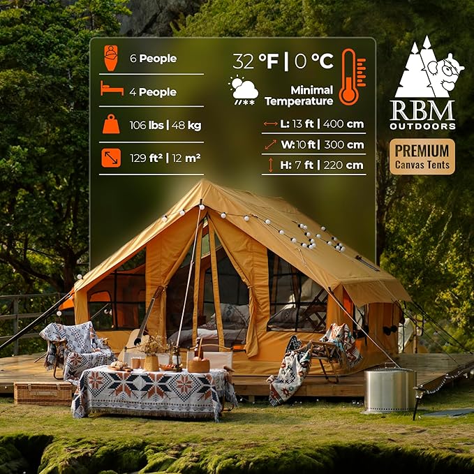 - Waterproof and Windproof inflatable tent with stove jack: The luxury tent 4-season big tents for camping, with a stove hole, handles rain, wind, snow, and sun. Inflatable tent for camping ideal for summer, spring, and fall, it stays cozy above 32°F (0°C). Includes accessories for winter camping. For heavy rain, use the included rain fly.