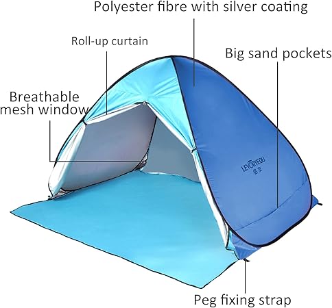 - Windproof: This beach tent has 2 large sandbags and 6 built-in tent pegs to keep the tent stable in the wind.
