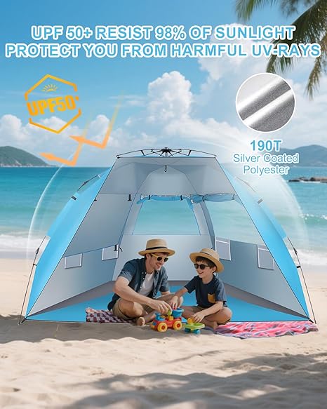 - [ULTIMATE FABRIC COMFORT EXPERIENCE]: Made with 190T polyester silver-coated fabric, our pop-up beach tent offers UV-proof and water-resistant protection, keeping you safe from harsh sunlight. The breathable yet enclosed design ensures comfort while providing a comfortable mosquito-free space