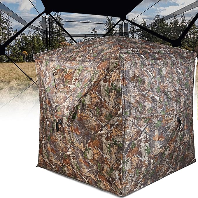 - 【AT ONE WITH NATURE】hunting ground blinds features 3 slient- sliding windows on each side, hunters remain undetected. The realistic camo pattern and brushed-in loops seamlessly blend the deer blind with the surrounding habitat for enhanced concealment tocamouflage.