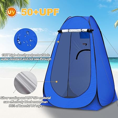 - Outdoor Privacy Tent: This pop up changing tent is mainly made of high-quality 190T polyester fabric. UV resistant silver coating inside, opaque finish, UPF 50+ sun protection. This camping tent is a great privacy shower/changing/toilet tent.