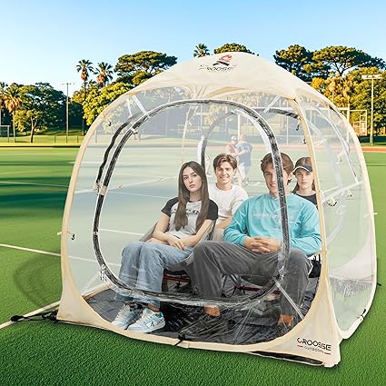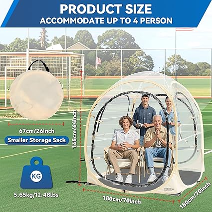 - ULTRA-CLEAR VISION: This PVC pop-up sports tent showcases five clear sides, offering a breathtaking 540-degree panoramic view. Delight in watching sports events or outdoor movies from within the tent. And please note that if wrinkles appear after folding, simply open the doors and windows to ventilate for 1 to 2 hours. This will enable the wrinkles to gradually disappear and restore the tent’s smooth appearance