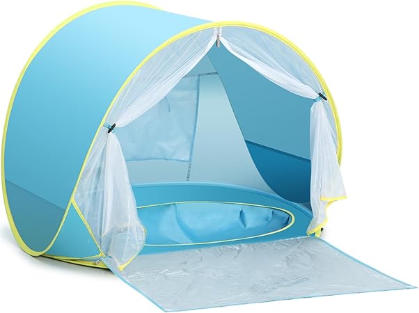- Extendable Play Area: The baby beach shade tent has a large opening at the front to expand the play area. The mesh curtains on the front of beach tent sun shelter can ensure an undisturbed sleep for your baby