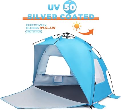 - ❥SUPERIOR MATERIAL–The body of tent is made of 190D Oxford cloth, bottom surface is made of 210D Oxford cloth. High-quality SILVER COATED Fabric ensure that whole beach tent Anti-UV effects, offers strong UPF 50+ UV protection,keeping you and your family away from the damage of the strong sunshine.