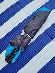Have used it twice on windy days at the beach and it has stayed up. As long as the side bottom pockets are filled with sand, it will stay in place. It will fit 3-4 adults comfortably without chairs. With chairs only 2 adults, maybe another one, but will be tight, plus 1-2 kids. I like the foldable curtains since it covers the sun when it changes position throughout the day. It came with no instructions, but it is easy to setup and close. When closing it up, pull up the elbows at the bottom to fold. It is compact when closed, approx. 38″ long and 9-10″ wide. The carrying bag is on the thin side, ours broke by the handle on the first lift. It is light to carry, but too heavy for the thin bag. An upgrade would resolve the problem. However, the vendor responded promptly and resolved the issue when contacted.
