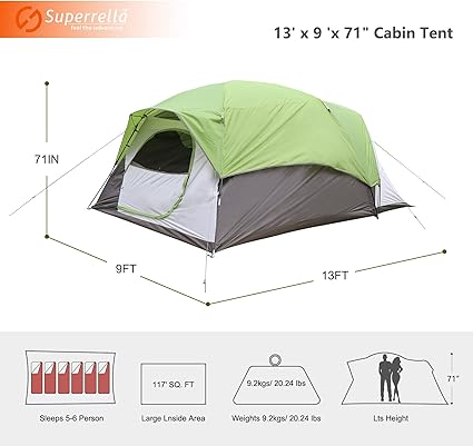 - Overall size is 13 by 9 feet and 71 inch height. With a roomy interior can accommodate 5-6 people sleeping.