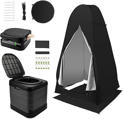 - 【ALL IN 1 PORTABLE TOILET KIT】An ergonomic portable folding toilet with a privacy pop-up tent, 12 trash bags, and 12 liquid waste gel packs.