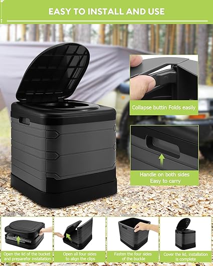 - 【Thoughtful Design】There are four safety buckles to ensure that your toilet remains upright, safe, and securely in use;Functional cover design to reduce the odor.Removable inner bucket allows easy and decent empty;Paired with garbage bags and solidifier, making cleaning easier. It is compatible with any 6-8 gallon bag.