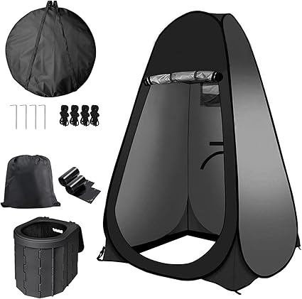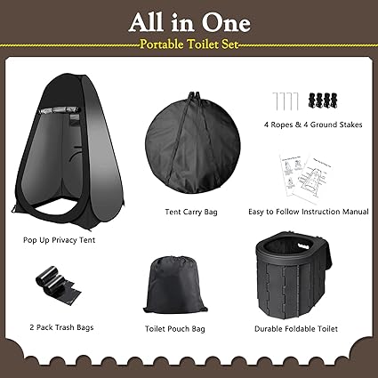 - All-in-One Outdoor Convenience: Our portable camping toilet tent, the perfect solution for your outdoor adventures. This innovative design combines a spacious privacy tent with a fully functional camping toilet, offering you ultimate convenience and privacy wherever you go. Inside the package, there are 1 pop-up camping bathroom shower tent, 1 carry bag, 1 camping toilet with storage bag, 2 rolls of waste bag (30 bags), 4 ropes, and 4 ground stakes