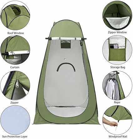- CONVENIENT SHOWERING EXPERIENCE: To provide you with a convenient showering experience, the tent features a fixing belt for the shower nozzle, a line for hanging clothes, and a storage bag.