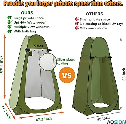 - EXTRA TALL-The large changing tent measures 74.8 inches high,42.7 inches long and wide, enough to allow you to stretch out freely inside. The 3 openable windows for increased breathability,we’ve includ shower bag for extra comfort when showering and changing.