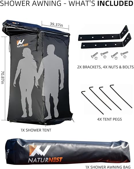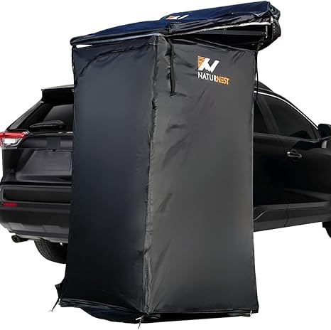 I bought this to go with our NaturNest roof top tent. This hooks up into our roof rack. It’s easy to open, just be careful with the arms that extend out. We’ve mostly used it as a changing tent when camping, but have it set up for a shower tent as well. It gets the job done, especially when you’re out at a primitive campsite! It could use more pockets on the inside of it, that’s my only recommendation. Would recommend!!