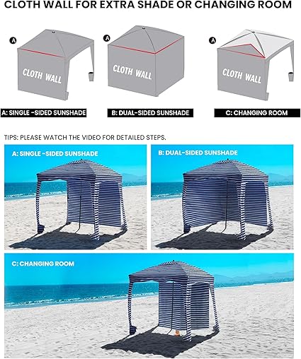 - 2024 Upgrade Beach Cabana: Qipi beach cabana tent featuring changing room or single or dual-side sunshade (view the video for detail steps). Changing room: Hang the hooks on the cabana frame to create a triangular shape, and zip it up.