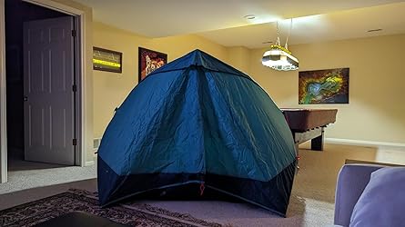 Really compact, easy to carry, seems sturdy. If you have 2 people in there, you’ll be tight. It did fit my air mattress though, and my only real complaint is it is really awkward for a tallish person to climb out of, and to do things like fill up an air mattress from outside.