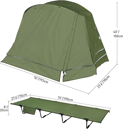 - 1 Person Size: 1-person camping beds and tents are suitable for single person to lie down and sleep. The size is 75”x28”x8”/190x70x20cm(camping bed) and 76”x28”x40”/193x70x100cm(camping tent). They can all be disassembled for easy carrying out and no tools need to be installed.