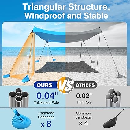 - Improved Stability, Resist High Wind: Our upgraded beach tent sun shelter is equipped with 8 sandbags, 4 thickened aluminum poles and 4 windproof ropes, sturdy connection withstand high winds. Besides, our canopy is attached to the sandbags with high quality nylon ropes, making it more stable and longer lasting.