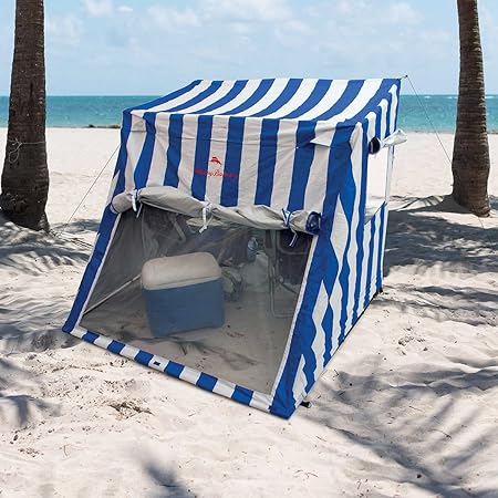 - Sand Pockets, Side tethers with Stakes to secure the shelter.