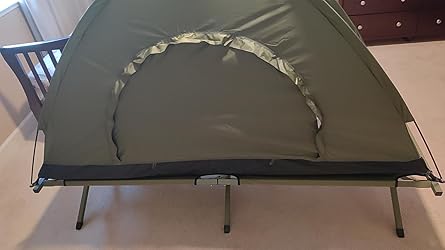 Today we opened and set this Camping Tent Cot up completely. Loved it. The cot was easy to set up in just a few minutes, it’s long and was very securely made. The added tent is also great because you get airflow and don’t have to sleep on the ground. There are carrying cases for the tent and the perfect cot. The cot is heavier obviously, but not so heavy you don’t want to lug it around to camp. In the day you can use the cot as a couch for seating minus the tent. I am quite pleased overall, and will likely get a few more. The price might seem steep but it’s a very solid construction.