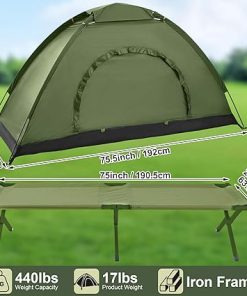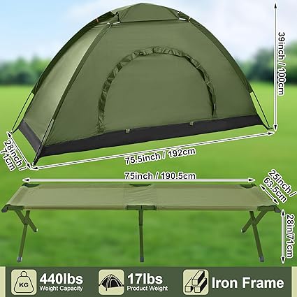 - Products Include: 1 x camping cot, cot dimensions: 75″ L x 25″ W x 16.5″ H, 1 x camping tent, tent dimensions: 75.5″ L x 28″ W x 39″ H, 4 x ground nails, 4 x wind ropes, and 2 x storage bags, both the tent and the camping bed are foldable