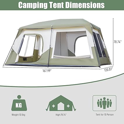 - Family Friendly Design: With its generous size, this tent comfortably accommodates a family of 10; It features a spacious interior with room for 4 queen air mattresses or 10 sleeping bags; Which makes it an ideal tent family camping trips, picnics, and outdoor gatherings