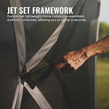 - Jet Set Framework allows you to set up your screen tent in a matter of seconds, no assembly required