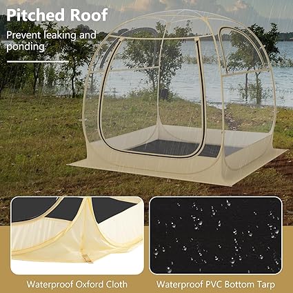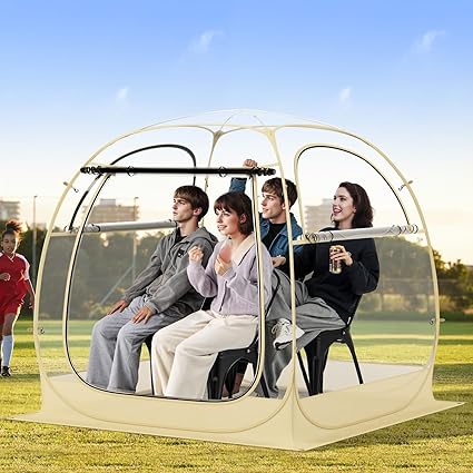 - Panoramic Clear View: The transparent PVC panels provide a 540° panoramic view, allowing you to enjoy sports events, camping or cozy gathering in a secure environment. Measuring 6 x 6 x 5.4 ft (L x W x H), the pop-up bubble tent can comfortably accommodate 5-6 people.