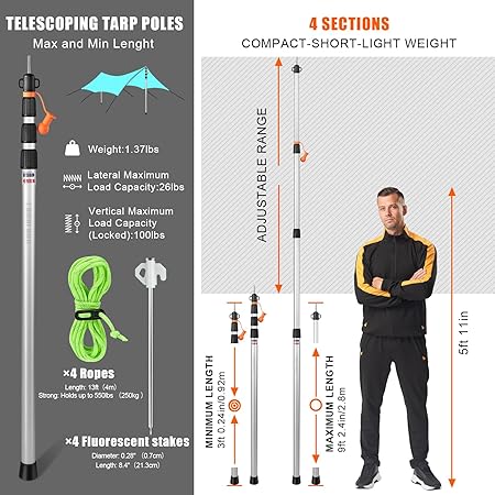 - EASY TO ADJUST: With twisting and releasing locking system, all you need to do is to stretch the tarp pole to the moderate length and rotate it to the right side to tighten up. The tarp pole can be shrunk to the shortest length when not in use. The extend-retract technology allows every tarp pole to easily adjust the height between 34.5 inches and 110.2 inches. Two sets of tarp poles can be put into an oxford cloth bag we provide for storage and every pole only weighs 1.3 pounds.