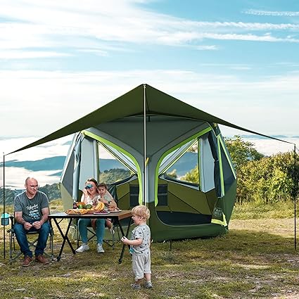 - Roomy and Cozy: Designed for 4-5 people, the tent dimensions are 96 x 121 x 78 inches, offering plenty of space for a queen air mattress or four sleeping bags and equipment. The 78-inch center height provides ample room to move without stooping, enhancing the comfort of your stay. It also includes multiple storage pockets and a gear loft for organized storage
