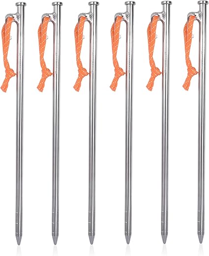 - Material: Made of titanium alloy, lightweight, never rust, not deformed, even for very hard soil is also easy to insert into, and they’re also rustproof to withstand all moisture conditions. So it can penetrate and hold firmly in a wide range of soil conditions.