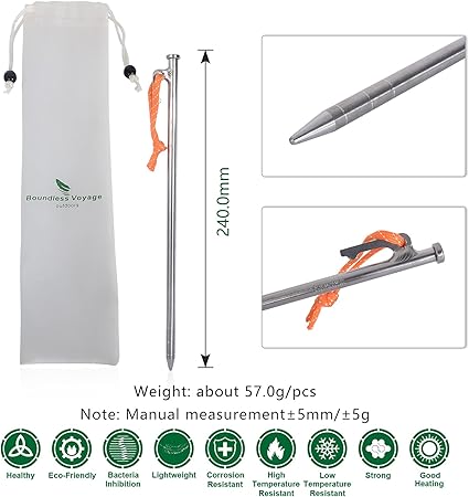 - Easy to use: The sharp tip allows you to easily drive the stake into the ground and easily pull it out with a hook. Suitable for working on hard or soft ground.The weight of each tent stake is only 57g/piece and the diameter is 8mm, make it light in weight and high in strength.